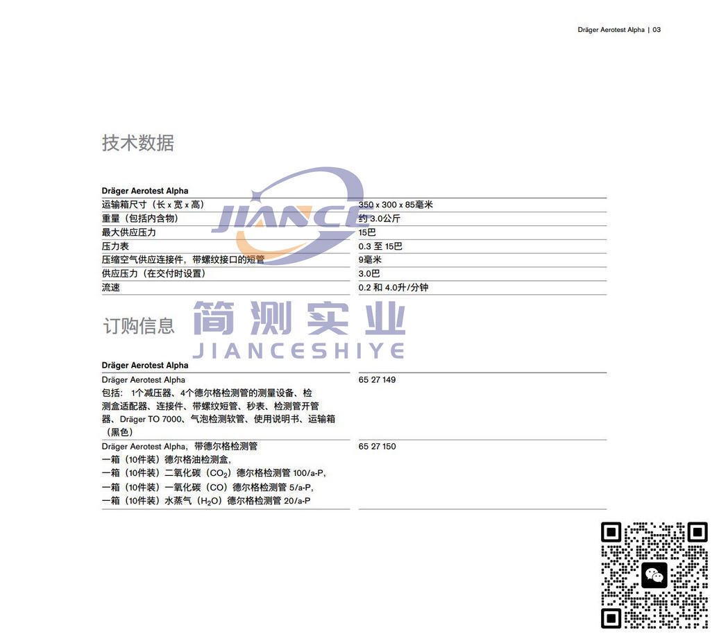 | Drager Aerotest Alpha 包括:1个减压器、4个德尔格检测管的测量设备、 检测盒适配器、连接件、带螺纹短管、秒表、检测管开管器、 Drager TO7000、气泡检测软管、使用说明书、运输箱(黑色) |
