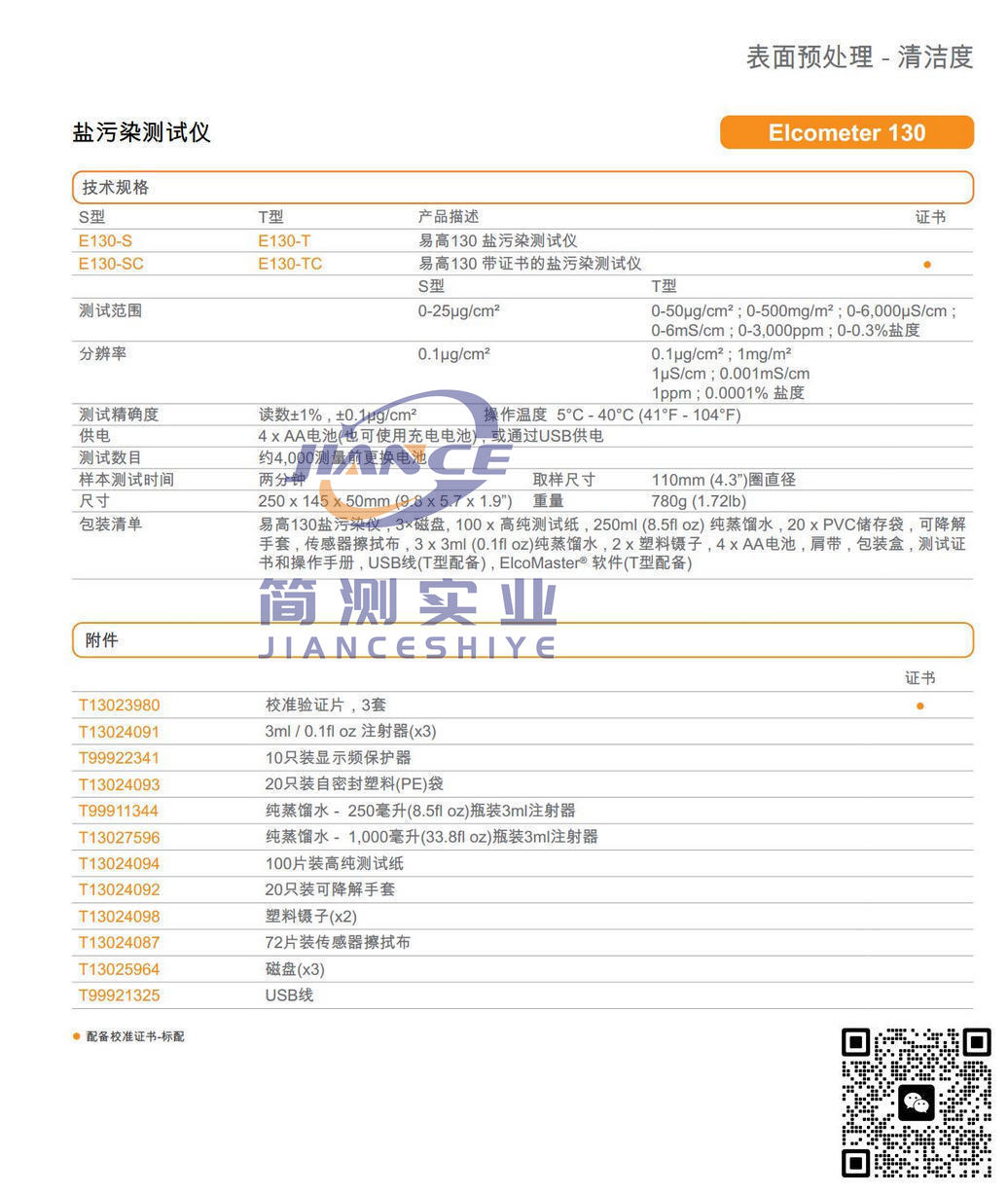 Product display简要描述:易高 E130-TC盐污染测试仪是E130-T带校准证书的型号,比Bresle等效测试方法快4倍以上。