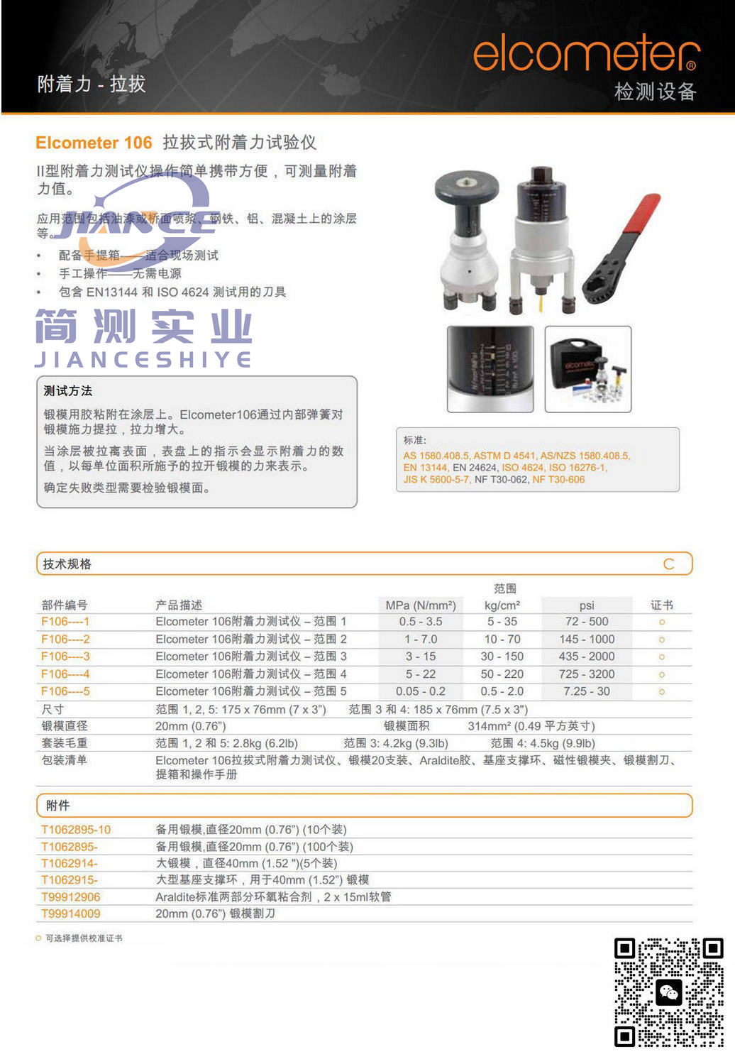 Product display简要描述:Elcometer 106附着力测试仪操作简单携带方便,测量范围广泛。MPa(N/mm2)为 0.05- 0.2,psi为 7.25-30。